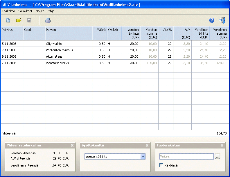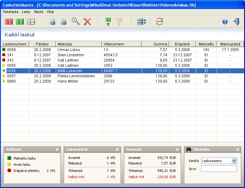 Kuhunkin rekisteriin voidaan liittää laskutietokanta, josta näkyvät kaikki tulostetut laskut listamuodossa. Listan yläpuolella näkyy tietokannassa olevien laskujen lukumäärä, maksamattomien laskujen määrä sekä eräpäivän ohittaneiden maksamattomien laskujen määrä. Listalla näkyvät kustakin laskusta laskunumero, maksaja, viitenumero, päiväys, eräpäivä, summa ja onko lasku avoin vai maksettu.