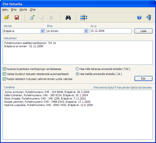 Tiedot löytyvät helposti isostakin tietokannasta ohjelman tehokkaalla hakutoiminnolla. Samalla voidaan tietueita rajata esimerkiksi laskutusta tai sähköpostin lähetystä varten. Etsi-ikkunassa voidaan luoda rajaton määrä vapaita hakulausekkeita ja lisätä ne hakulistalle. Rekisteristä voidaan esimerkiksi hakea tietueet joiden puhelinnumerossa on suunta 09 ja joiden osoitteessa on maa Suomi.
