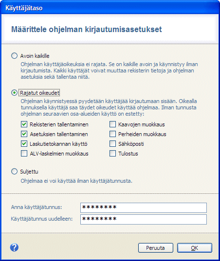 Ohjelman käyttöä voidaan rajoittaa määrittelemällä käyttäjätasoja. Ohjelma voidaan jättää avoimeksi kaikille tai se voidaan määritellä kysymään käyttäjätunnus ohjelmaa käynnistettäessä. Ilman käyttäjätunnusta voi ohjelmaa käyttää rajoitetusti esimerkiksi niin, että tietoja voidaan lukea, käsitellä ja tulostaa, mutta niitä ei voi muuttaa eikä tallentaa. Myös ohjelman asetuksien ja käyttäjätietojen muokkausta voidaan rajoittaa.