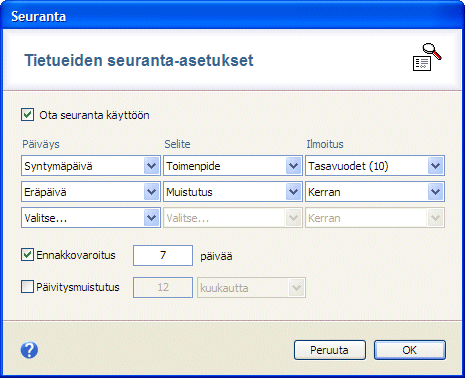 Tietueen kenttiä voidaan asettaa seurantaan, jolloin ohjelma tarkistaa kenttään kirjatun päivämäärän aina kun tiedosto avataan. Ohjelma antaa ilmoituksen tietueista, jotka ovat ohittaneet seurantapäivän tai lähestyvät sitä (ennakkovaroitus). Ohjelma voi seurata myös sitä, koska tietueiden tietoja on viimeksi muutettu, ja ilmoittaa kun tietueen päivityksestä on kulunut tietty aika.