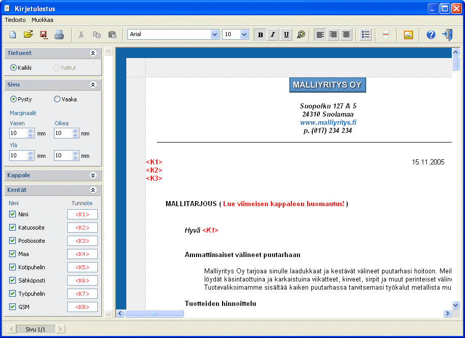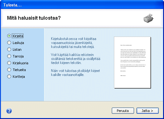 Kirjetulostuksessa tekstiä voi muokata tekstinkäsittelyohjelman tavoin ja yksilöllisten jäsen- tai kutsukirjeiden teko sujuu tekstiin upotettavien henkilötietojen avulla sujuvasti. Tekstit voi myös hakea tiedostosta tai raahata suoraan vaikka Wordistä. » Katso kuva