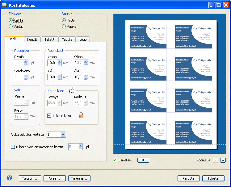 Korttitulostus mahdollistaa käynti-, jäsen-, asiakas- tms. korttien tulostamisen suoraan Klaanista. Kortille voidaan määritellä taustakuva ja logo sekä erilaisia tekstialueita, joihin voit upottaa tietoa myös suoraan rekisteristä. » Katso kuva