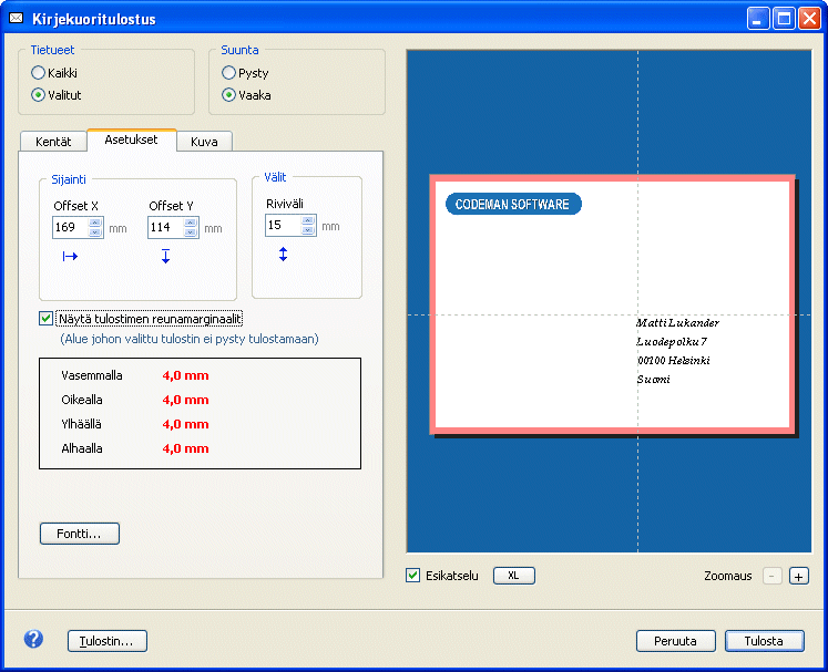 Kirjekuoritulostuksessa voidaan osoitteen sijainti kuoreen määritellä tarkasti. Kuoreen on myös mahdollista tulostaa kuva, esimerkiksi yrityksen logo. Kuten muissakin tulostusmuodoissa tekstin merkkilaji ja riviväli ovat vapaasti valittavissa. » Katso kuva