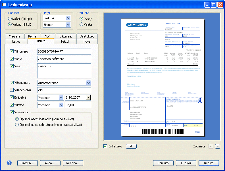 Laskutulostuksen tyyliksi voidaan valita standardilasku tai pelkkä tilisiirtolomake. Laskuun voidaan liittää alv-laskelmia, omia tekstejä ja kuva, esimerkiksi yrityksen logo. Summat ja eräpäivät voidaan ottaa suoraan tietueen kentistä tai syöttää manuaalisesti. Ohjelma laskee viitenumerot ja tulostaa viivakoodit. Tulostetut laskut voidaan tallentaa laskutietokantaan. » Katso kuva