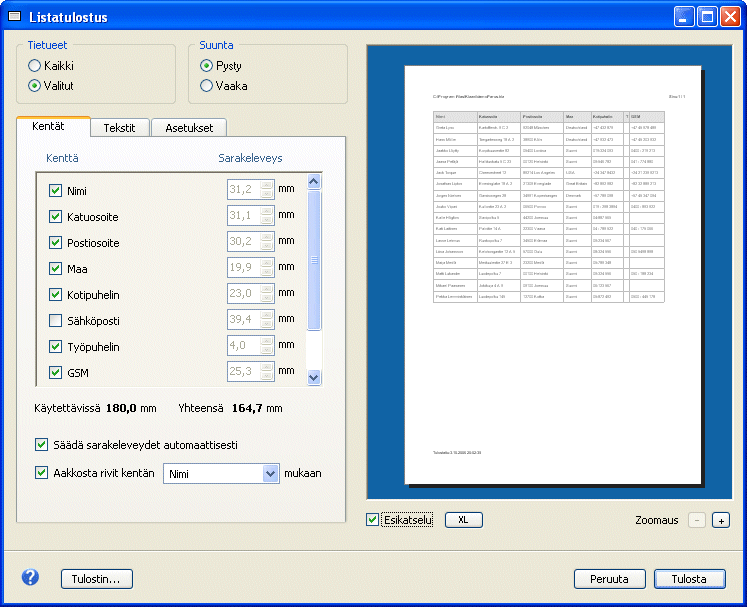 Listatulostukseen voidaan liittää valmiita ja vapaita tekstejä. Listan sarakeleveydet voidaan säätää automaattisesti tai manuaalisesti. Merkkilaji, riviväli ja sisennykset on vapaasti säädettävissä. Lista voidaan valinnaisesti tulostaa ruudukkona, vaaka- tai pystyviivoilla tai kokonaan ilman viivoja. » Katso kuva